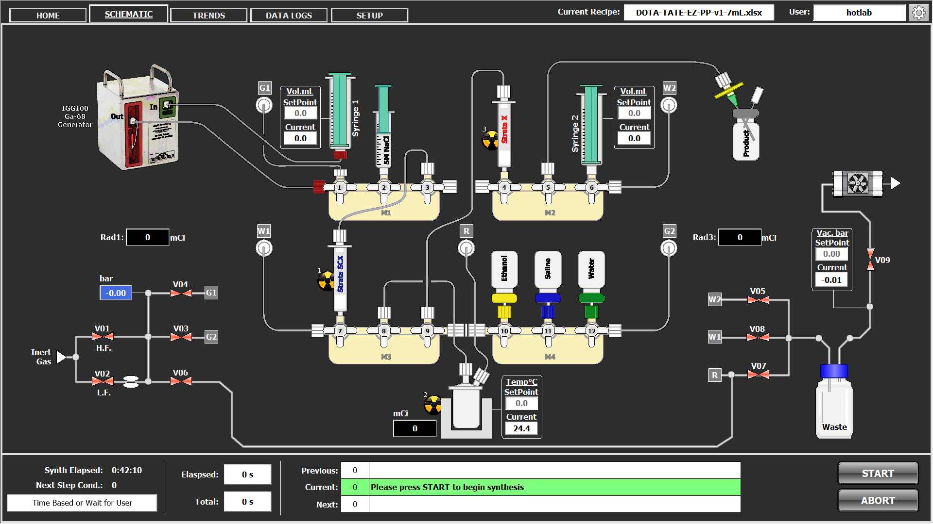 - Встроенный он-лайн контроль. Радиометрические детекторы в модуле и блоке расширения, реальный-времени тренды датчиков, хранение истории синтезов и генерация отчётов для документации и внутреннего контроля.